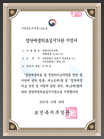 이번 지정으로 강동아이비의원은 보다 안전하고 체계적인 관리하에 줄기세포 치료 및 재생의학 관련 연구·시술을 수행할 수 있게 되었습니다.